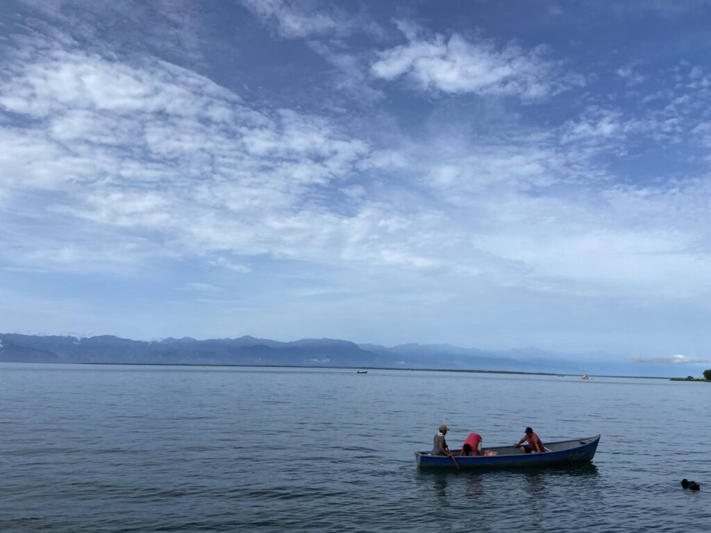 Olga se sienta a la mesa y nos dice que un día de enero de 2017 estas aguas diáfanas que ahora mecen nuestros pies amanecieron teñidas de color rojo. Poco después, cuenta Olga, los pescadores vieron manatíes, tortugas y peces muertos en la playa del lago.