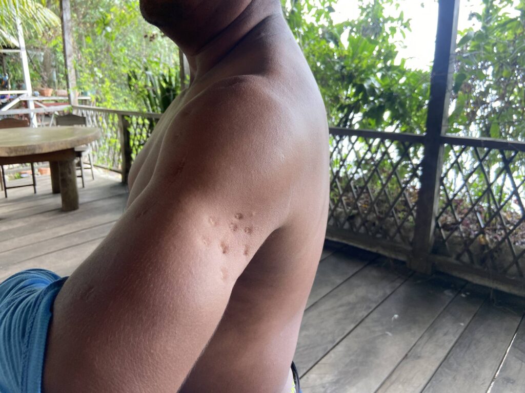 Amanece sobre el lago de Izabal. Jaguar y Lobo, nuestro guía del capítulo anterior, nos esperan en el muelle junto a un tercer líder q’eqchi’, que se presenta de una forma particular: se quita la camisa y muestra unas cicatrices en su brazo izquierdo. Son ocho puntos hundidos en su piel que forman una especie de círculo. Cerca hay otras heridas lineales y más arriba, llegando a su hombro, más puntos dispersos. “Esto es de un escopetazo que me dieron hace unos años, de milagro me logré salvar”, dice. También dice que tiene miedo de que la próxima vez no corra con tanta suerte y por eso pide ocultar su nombre. Lo llamaremos Venado.
