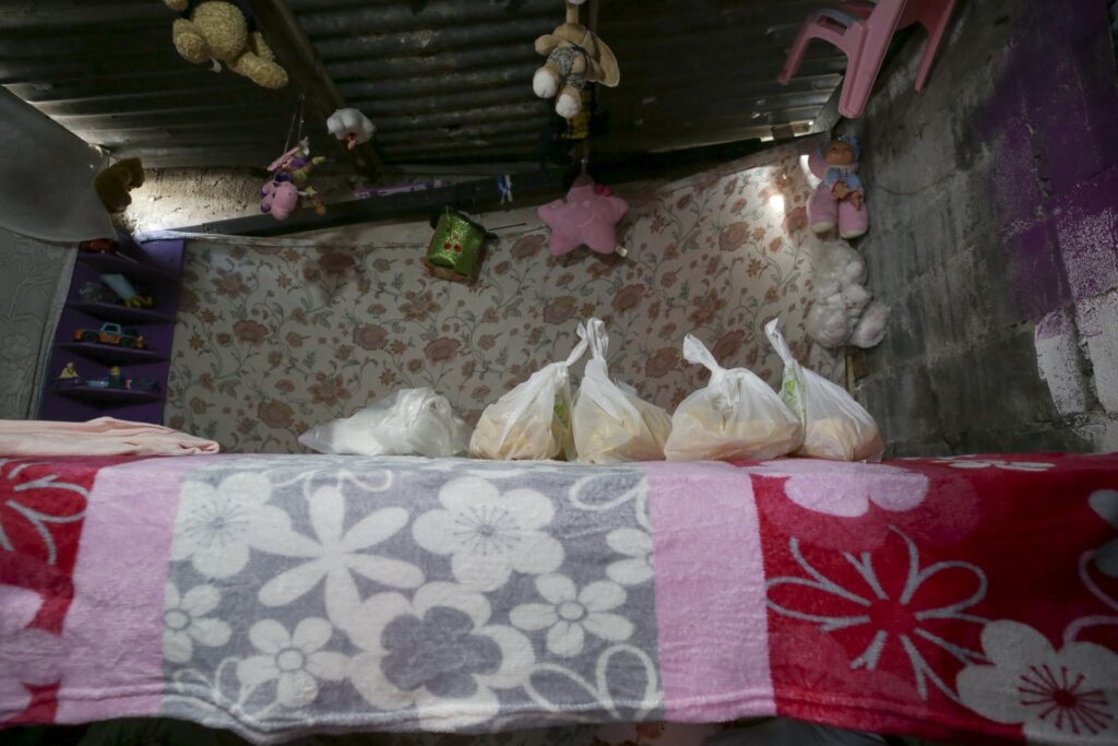 Mientras hace su pan, también fríe pollo en una plantilla de gas ubicada entre la mesa donde prepara su pan de coco y la cama donde por las noches duerme con su hija.