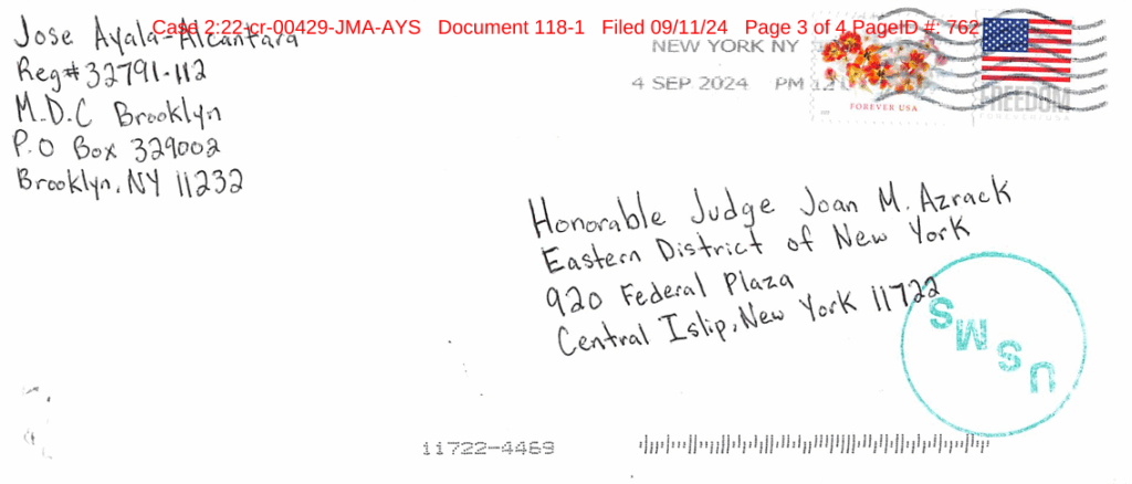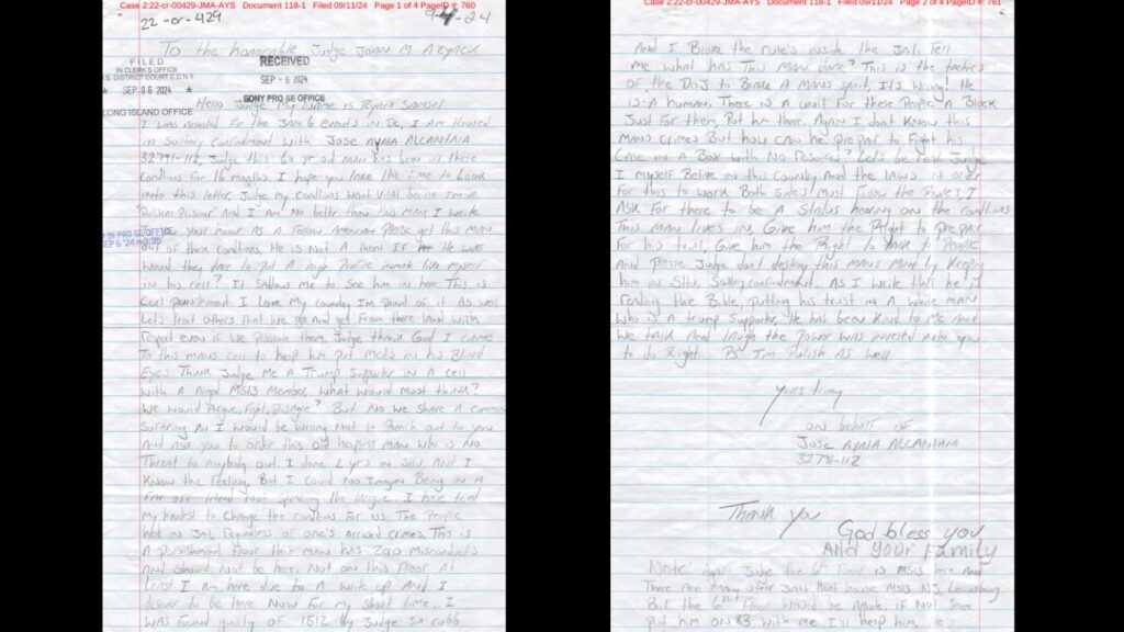 El 4 de septiembre de 2024, Indio envió otra carta escrita a mano, pero sus quejas a la jueza en realidad las escribió su compañero de celda: Ryan Stephen Samsel.