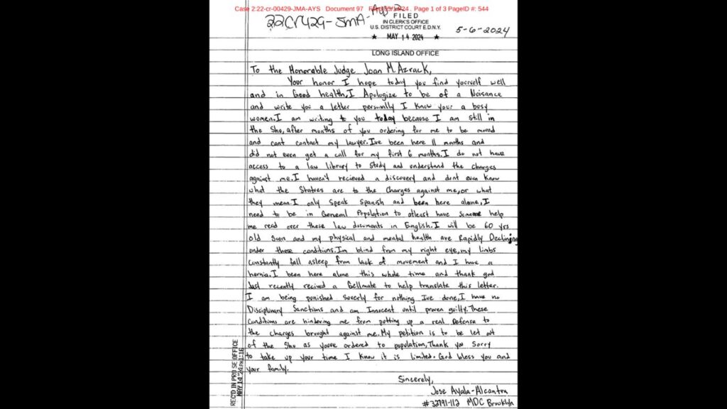 Desde ese aislamiento, Indio ha enviado dos cartas a la jueza solicitando auxilio ante las severas y restrictivas condiciones en las que vive. En ellas se dice vulnerado y con graves problemas de salud ante la segregación que dice vivir. Dicha correspondencia está escrita a mano en inglés y en tono de súplica. El veterano fue el primero de los líderes pandilleriles en exponerle a la jueza Joan Azrack sus complicaciones. Indio estaba desesperado.