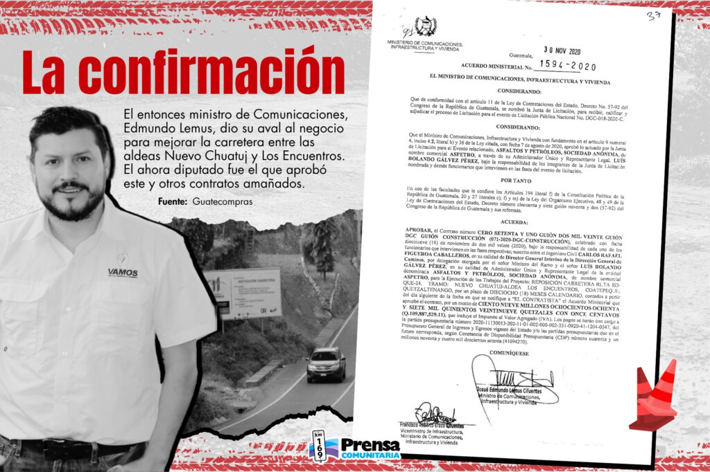 Los pormenores de la obra habían sido definidos tres meses antes, cuando se firmó el contrato: la empresa Asfaltos y Petróleos se encargaría de mejorar la carretera, colocaría un asfalto de ocho centímetros y tendría 18 meses para concluir los trabajos. Edmundo Lemus fue el que dio el visto bueno a estos detalles al aprobar la totalidad del contrato. Con su aval, el negocio trucado estaba hecho.