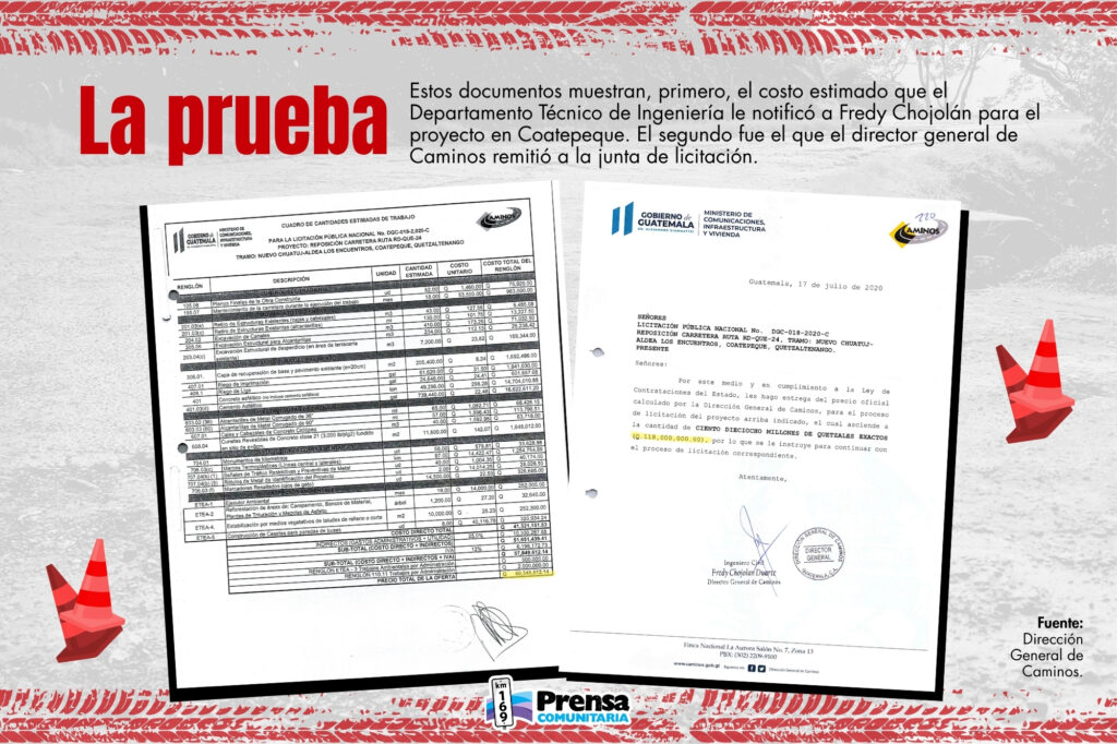 Fredy Chojolán rechazó el estudio y decidió valuar la obra en casi el doble. Si el director general de Caminos no hubiera cambiado el precio estimado de la obra, el Estado habría obtenido una oferta más asequible. Incluso, la empresa a la que se le asignó el proyecto jamás habría sido contratada, porque su oferta nunca hubiera entrado entre los márgenes de precios aceptados por la Ley de Contrataciones del Estado.