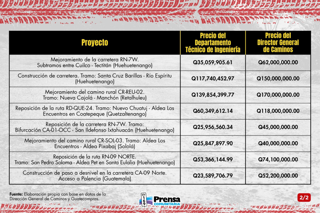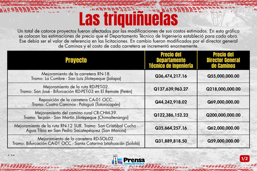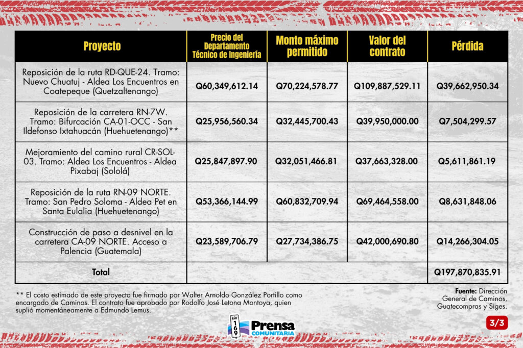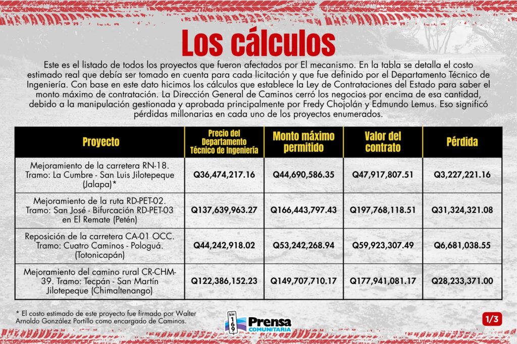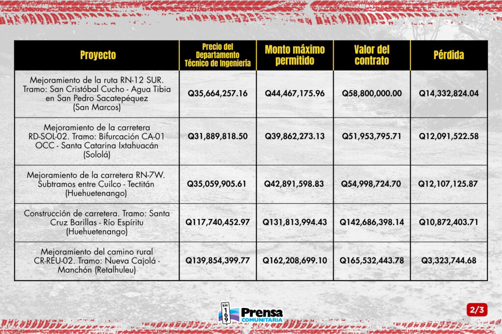Este mecanismo, lamentablemente, se aplicó en catorce proyectos carreteros, cuya contratación se inició en el primer año del gobierno de Alejandro Giammattei. Las obras perjudicadas por este procedimiento están en los departamentos de Jalapa, Petén, Totonicapán, Chimaltenango, San Marcos, Sololá, Huehuetenango, Retalhuleu, Quetzaltenango y Guatemala. Solo por esta operación, como se adelantó al inicio, el Estado perdió Q197.87 millones (US$25.76 millones).