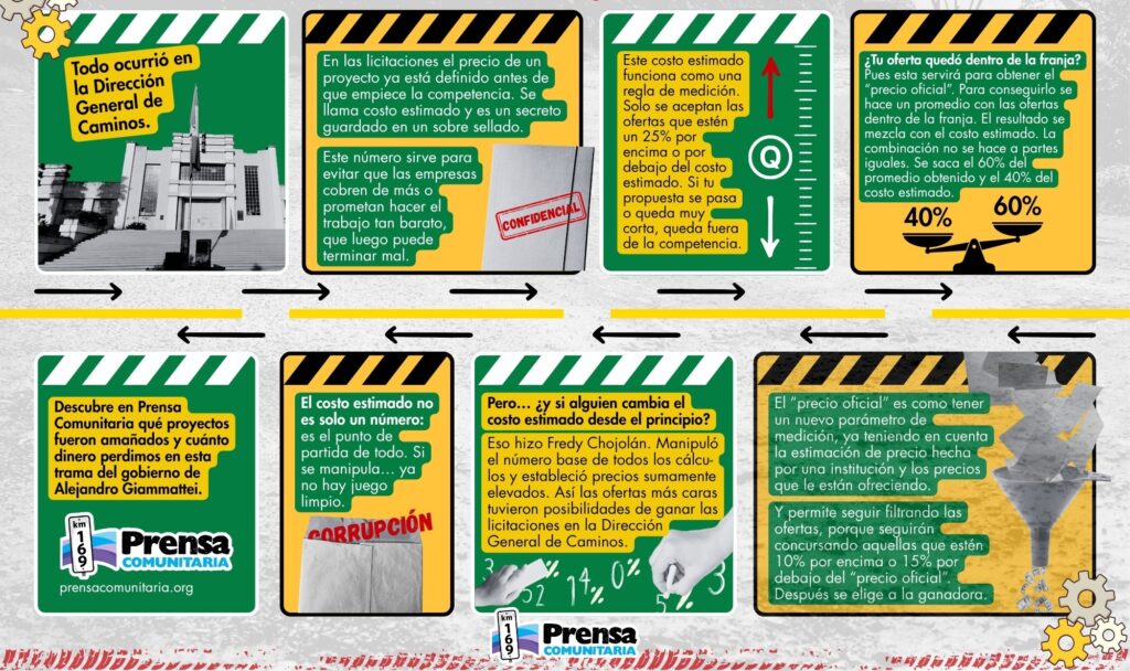 En cambio, otras dos empresas siguieron en la contienda. La ganadora se conocería días más tarde. Sin embargo, en ese momento, la licitación ya estaba amañada. El mecanismo, un largo esquema en el que se modificaron los costos estimados para sobrevalorar las obras, se había puesto en marcha y afectaría a este y otros trece proyectos. El monto que perdería el Estado sería similar a la estafa de las vacunas rusas Sputnik V o la defraudación identificada en el caso B410, que identificó una red de empresas de cartón que sirvieron para evadir impuestos.