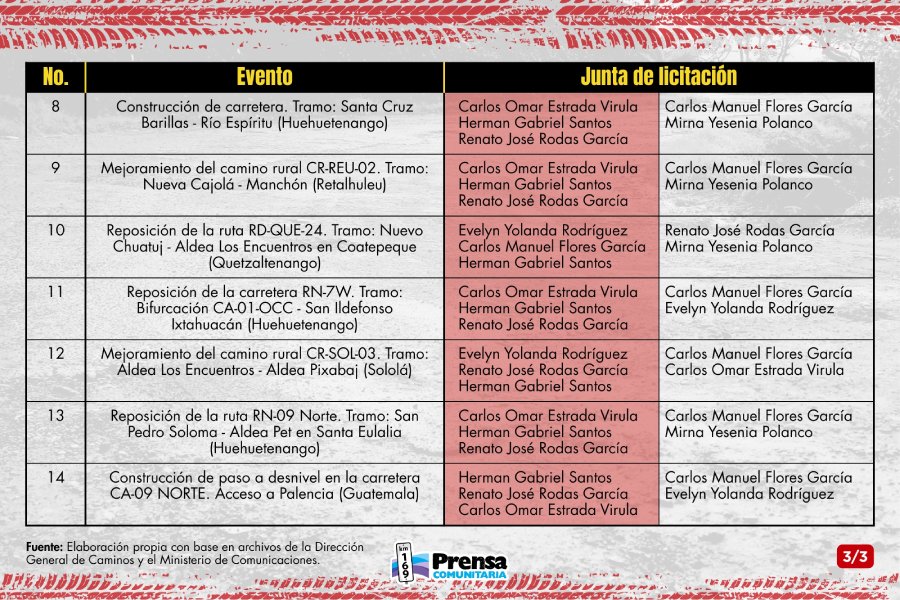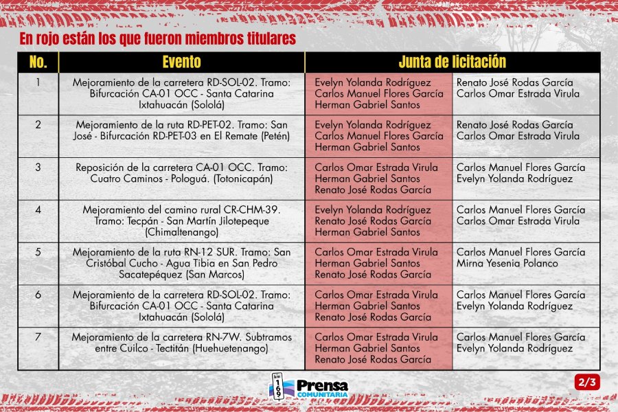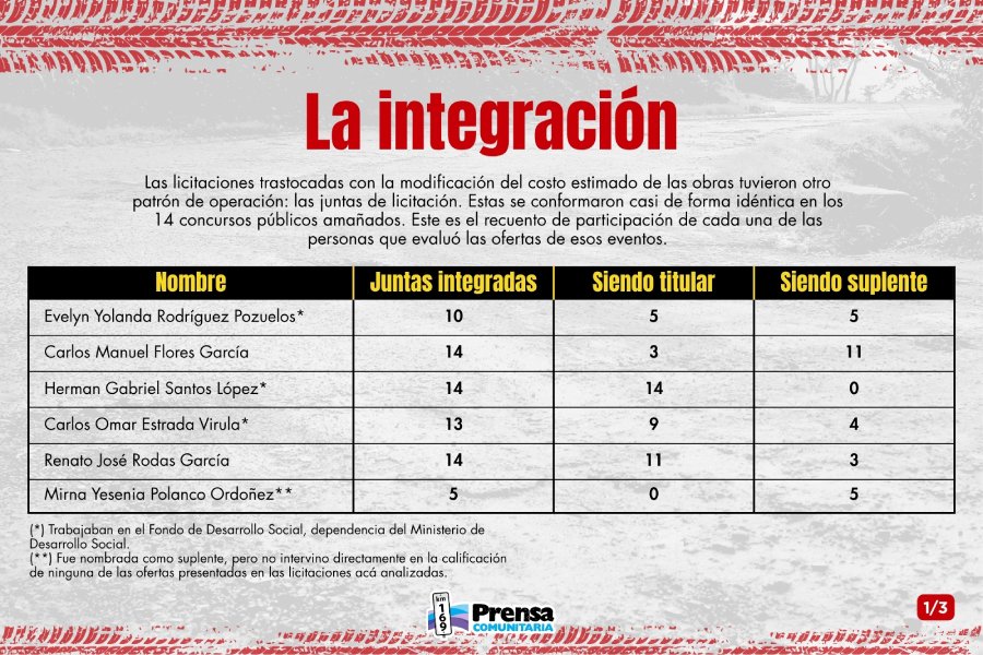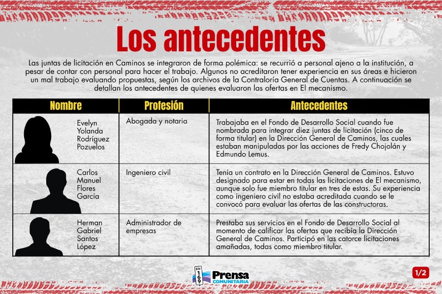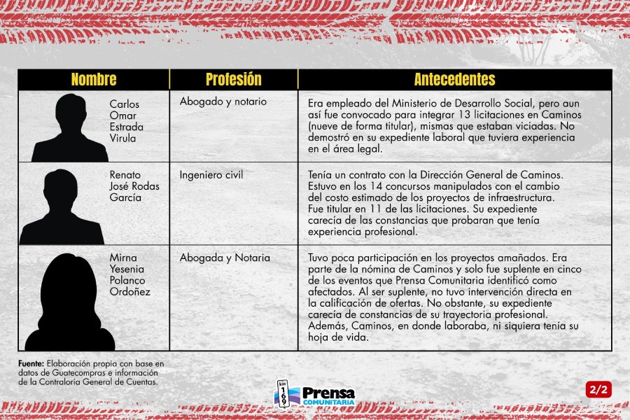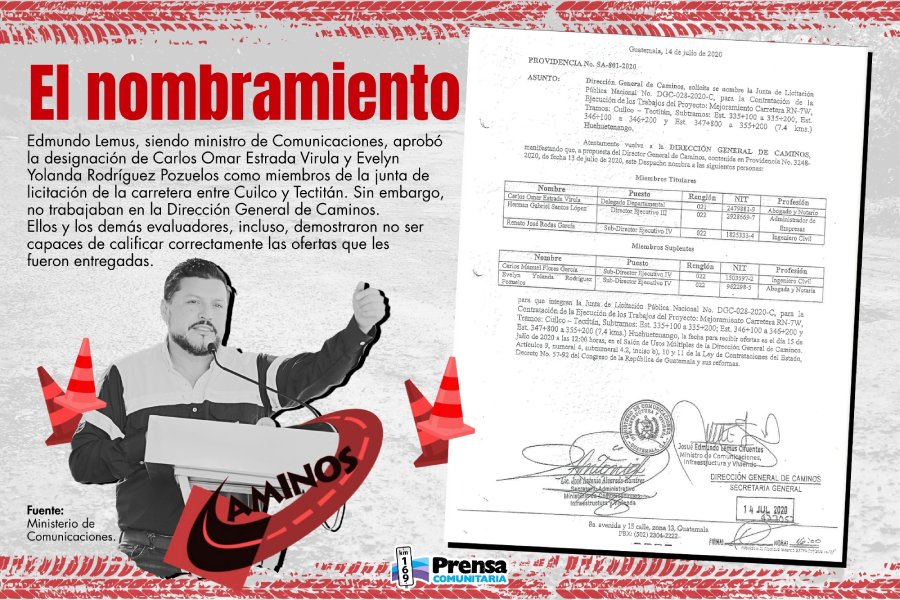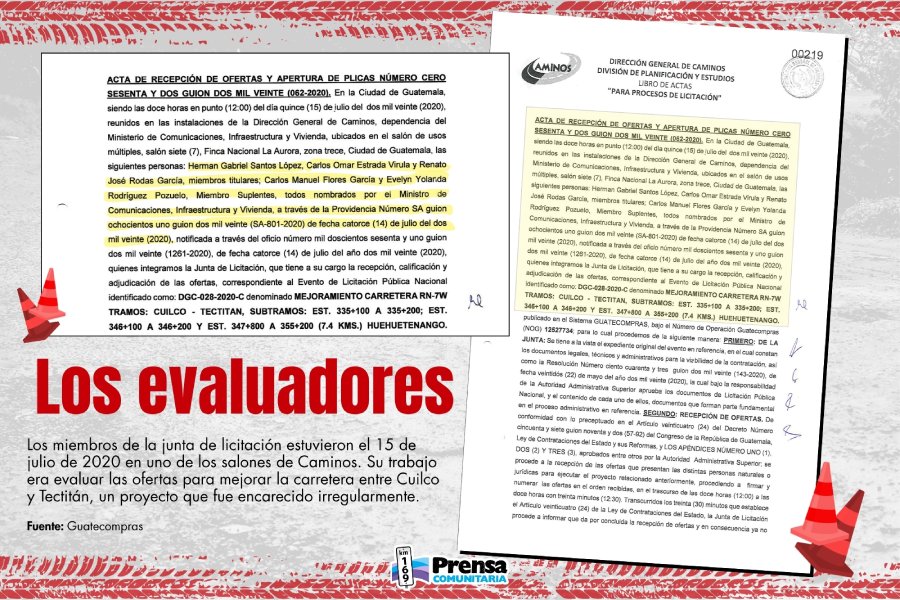 En aquella licitación de Cuilco y Tectitán estaban en la Dirección General de Caminos tres personas que eran parte de la planilla del Ministerio de Desarrollo Social. Se trataba del abogado Carlos Omar Estrada Virula y el administrador Herman Gabriel Santos López, ambos como miembros titulares; y de la abogada Evelyn Yolanda Rodríguez Pozuelos como suplente.