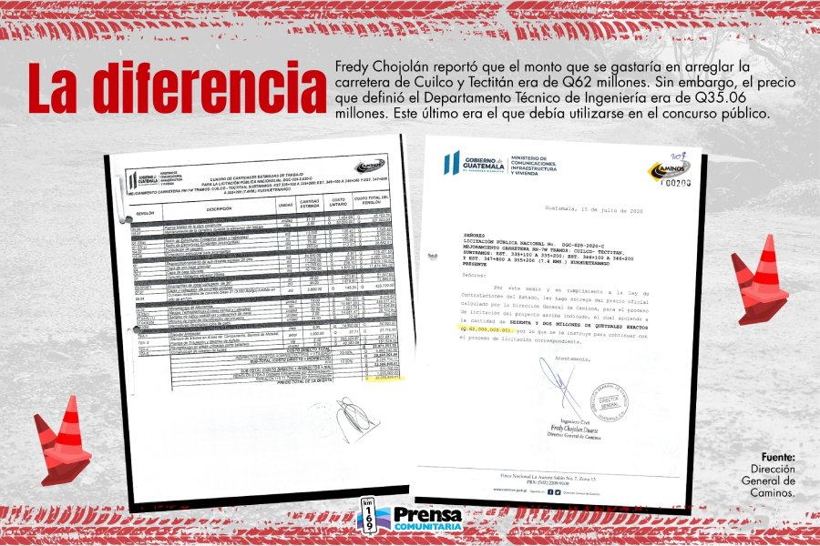 Los propios especialistas del Departamento Técnico de Ingeniería de Caminos le habían advertido que por esta obra se gastarían Q35.06 millones (US$4.56 millones). El detalle quedó registrado en un documento, muy sencillo, pero en el que se pormenorizaban las actividades y materiales necesarios para la ruta.