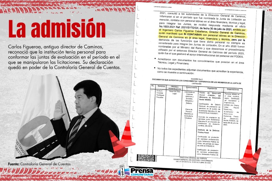También refirió que desconocía el procedimiento utilizado para requerir ese soporte. Lo más grave fue que Carlos Figueroa reconoció que, para la fecha en la que se realizó el concurso público para mejorar la carretera entre Cuilco y Tectitán, Caminos sí contaba con personal idóneo en las áreas legal, financiera y técnica. Los implicados no se quedaron callados.