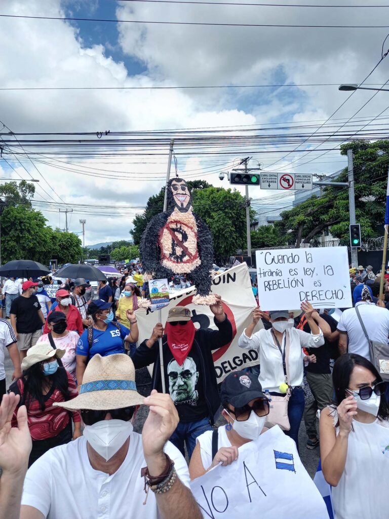 Manifestantes marchan en protesta contra la Ley Bitcoin. Imagen por Daniel Valencia. Redacción Regional.