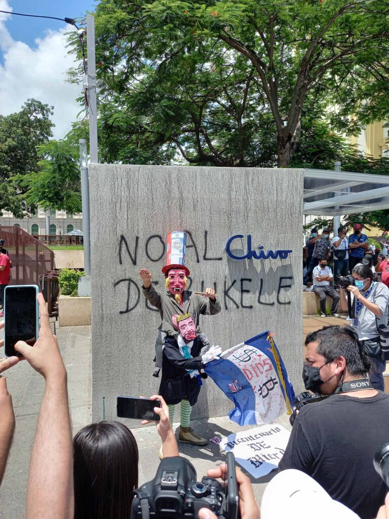 Al finalizar la primera gran marcha opositora contra el oficialismo de Nayib Bukele, el 15 de septiembre de 2021, manifestantes protestaron y destruyeron la caseta Chivo Wallet ubicada en la Plaza Gerardo Barrios del centro capitalino. La Ley Bitcóin es la política de Bukele más rechazada por la población, según las encuestas. Imágenes por Daniel Valencia, Redacción Regional