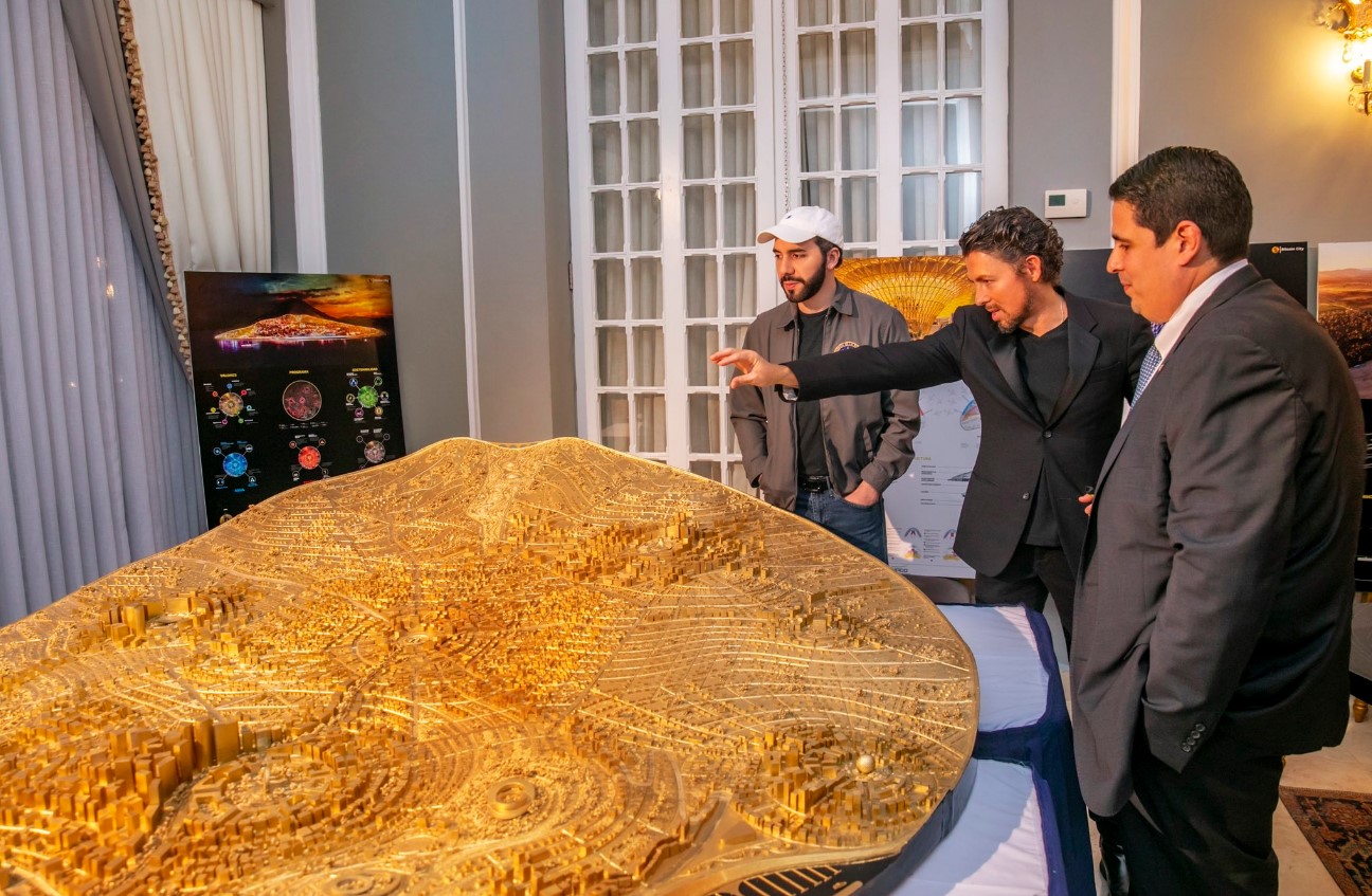 “#Bitcóin, la ciudad va muy bien”, tuiteó Bukele el 9 de mayo de 2022, junto a una secuencia de fotografías en las que aparece observando una maqueta de ‘Bitcoin City’, el supuesto proyecto a desarrollarse con la apuesta Bitcoin de su gobierno. La Ley que definió la legalidad del uso de la criptomoneda ha sido rechazada por la población en todas las encuestas posteriores a la creación de la misma, en junio de 2021. Imagen tomada de la cuenta oficial de Nayib Bukele en X.