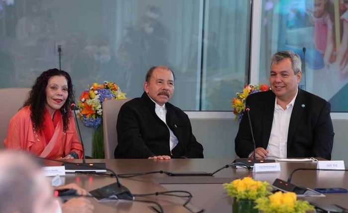 Daniel Ortega y Rosario Murillo sostienen una reunión con el presidente del BCIE, Dante Mossi, durante una visita a Managua ocurrida en marzo de 2022. Foto tomada de Presidencia de Nicaragua.