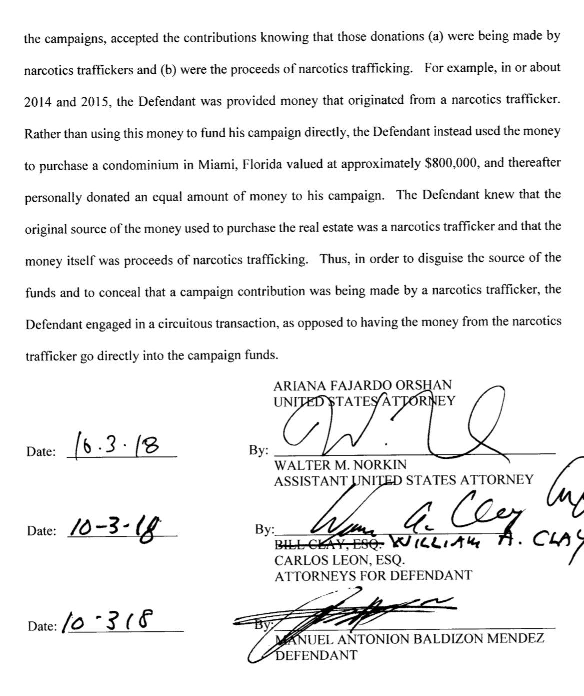 Después del “mea culpa” de Baldizón, en septiembre de ese año fue acusado del delito de lavado de dinero en Estados Unidos, un cargo por el cual la fiscalía podría pedir hasta 20 años de prisión. El 3 de octubre de 2018 Baldizón reconoció la recepción de fondos provenientes del narcotráfico entre los años 2014 y 2015 para su campaña política. Al menos $800 mil para sus actividades políticas y una cifra similar que empleó para la compra de un apartamento en Miami, según refiere el boletín del Departamento de Justicia estadounidense sobre el caso No.18-CR-20758-Cooke.