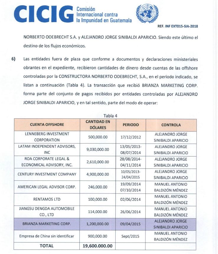 La red de empresas y transferencias recogida en el informe del Departamento de Investigaciones y Litigio de CICIG, REF. INF EXT015-SIA-2018, forma parte de una base de datos de registros financieros entregada al FBI por el Meinl Bank, el banco de Antigua y Barbuda adquirido por Odebrecht para pagar sobornos a diferentes figuras políticas de al menos 12 países a cambio de obtener contratos públicos de construcción. En la base de datos facilitada por Meinl Bank también se muestran operaciones reportadas a favor de offshore “controladas” por el exministro de Comunicaciones Alejandro Sinibaldi, quien continúa en prisión y ligado a proceso por el caso Odebrecht.