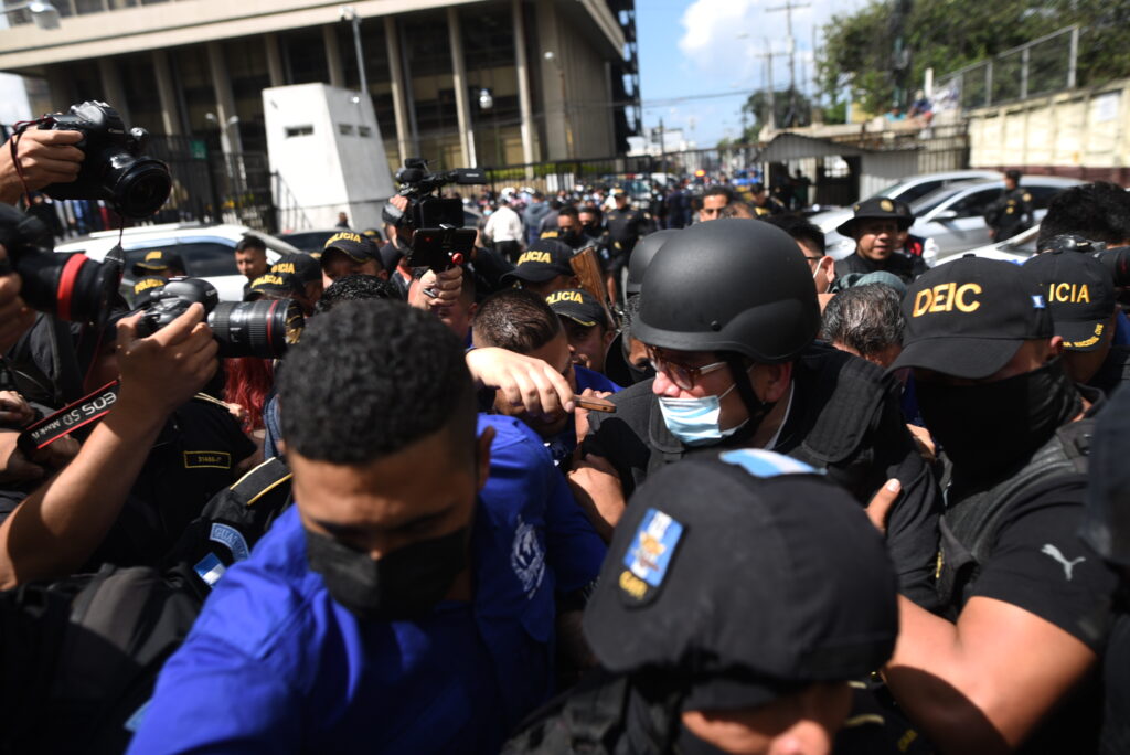 Manuel Baldizón es llevado a Torre de Tribunales entre decenas de periodistas y agentes de la Policía Nacional Civil el 5 de octubre de 2022, minutos antes había llegado al aeropuerto La Aurora al ser deportado desde Estados Unidos y cumplir una condena por lavado de dinero. Foto/Edwin Bercián