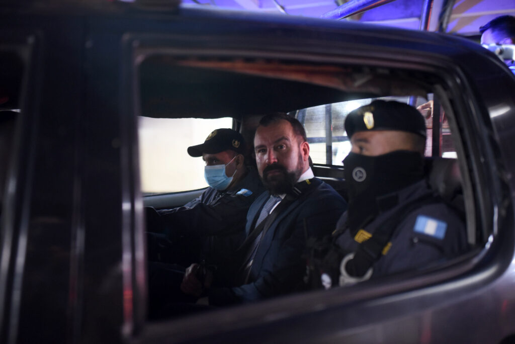 El exministro de Comunicaciones, Alejandro Sinibaldi, es captado dentro de una patrulla al salir de una audiencia en Torre de Tribunales el 24 de abril de 2022. Foto/Edwin Bercián