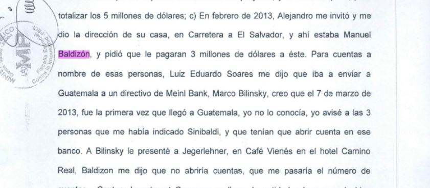 “En mayo o junio de 2015, no recuerdo la fecha, cuando por la mañana me llamó el doctor (Manuel) Baldizón y me citó a una reunión a su oficina privada a las cinco de la tarde. Llegué a las 5:30 horas ya estaba Carlos Machado (secretario privado de Baldizón en ese entonces) y el señor Marcos (de Cerqueira Lima) Machado (directivo de Odebrecht). Marcos me dijo que estaban en la disposición de apoyar en la campaña del partido Líder”, declaró ante el juzgado de Mayor Riesgo D, entonces dirigido por la jueza Ericka Aifán.