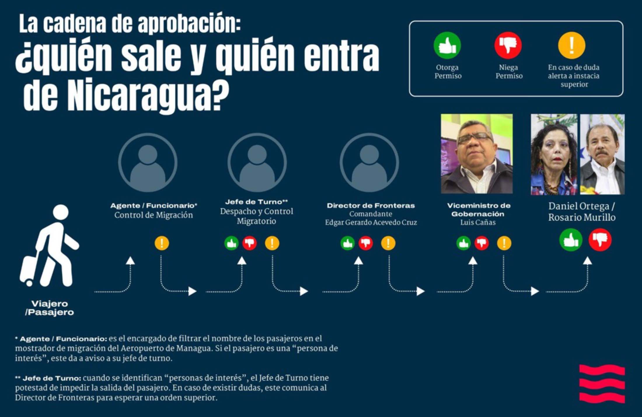 El mecanismo de control político es más eficaz en el Aeropuerto Augusto C. Sandino, la principal puerta internacional del país, según fuentes de Migración. Los agentes migratorios reciben, con 72 horas de anticipación, listas actualizadas de parte de Gobernación de pasajeros con “alertas a reportar”. Las listas son solicitadas antes a las aerolíneas, aunque los agentes también rastrean la información de los pasajeros que aterrizan o despegan desde Managua. Son una decena de oficiales que conforman tres grupos del Departamento de Despacho y Control Migratorio, que no sobrepasan los 35 años y tienen conocimientos de informática, uso de buscadores y redes sociales. Cualquier dato, publicación en redes sociales o vínculo que a ellos “les parezca sospechoso” es suficiente para armar una ficha del pasajero y considerarlo no apto para ingresar o salir del país o para decomisar el pasaporte al viajero si es nacional.