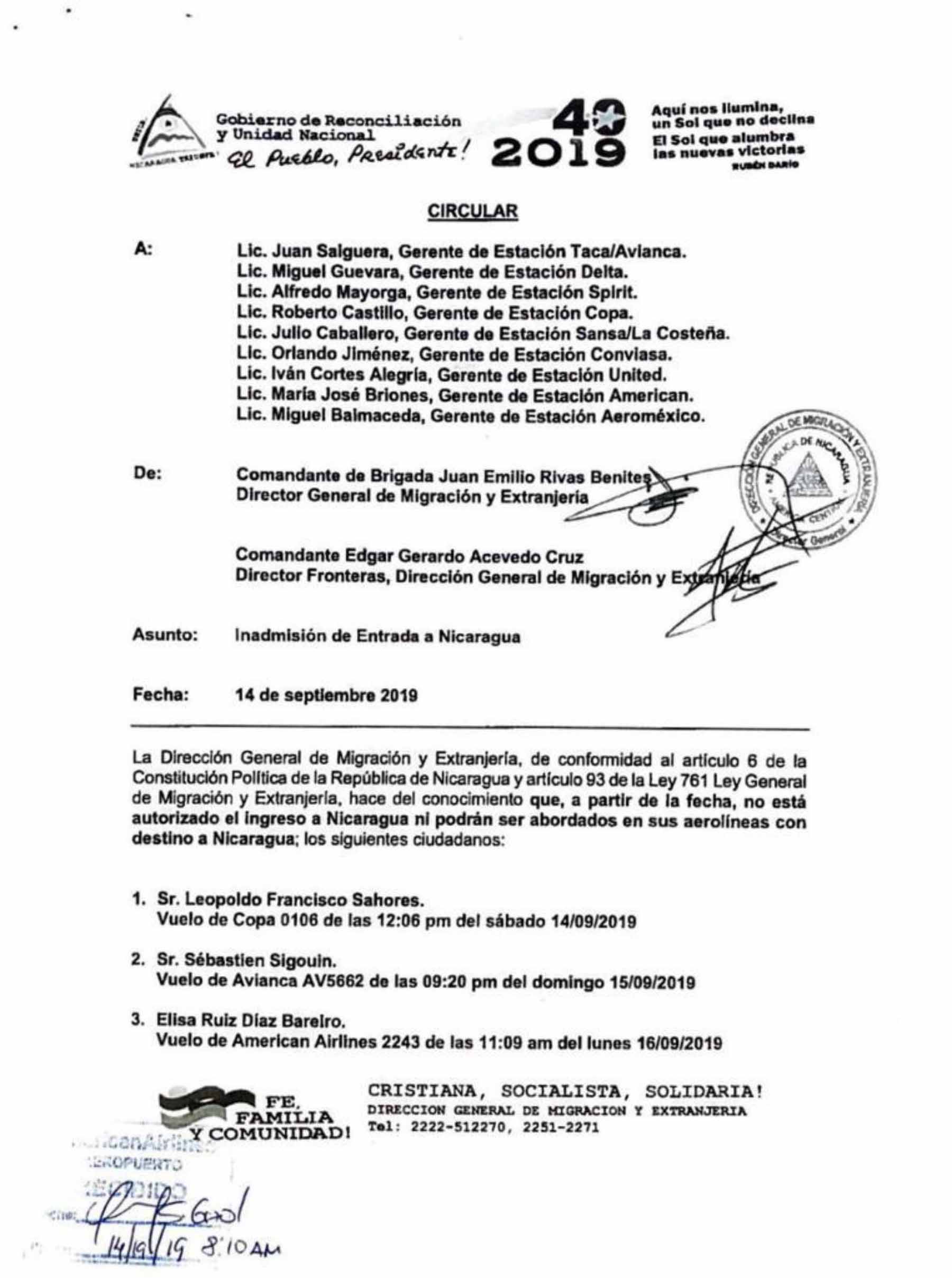 El 30 de noviembre, el delegado de la agencia EFE en Nicaragua, Luis Felipe Palacios, corrió con la misma suerte cuando intentó regresar de Panamá después de un viaje de trabajo. “Le compartimos que la solicitud de ingreso no ha sido autorizada por las autoridades de Migración y Extranjería de Nicaragua. No le será permitido embarcar”, según el correo electrónico que remitió al delegado de EFE en Nicaragua la aerolínea Avianca.
