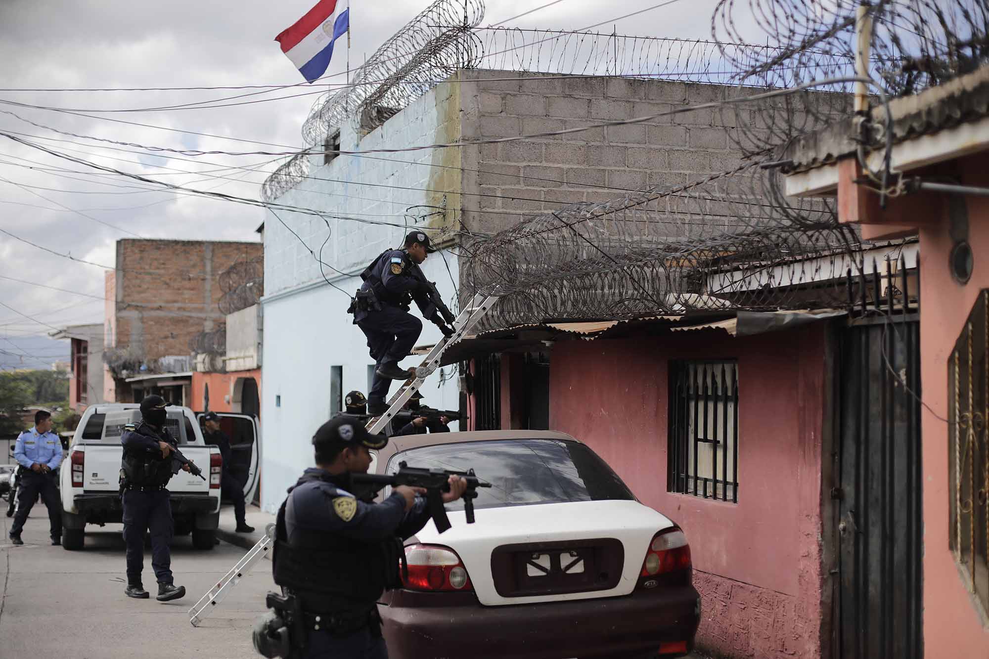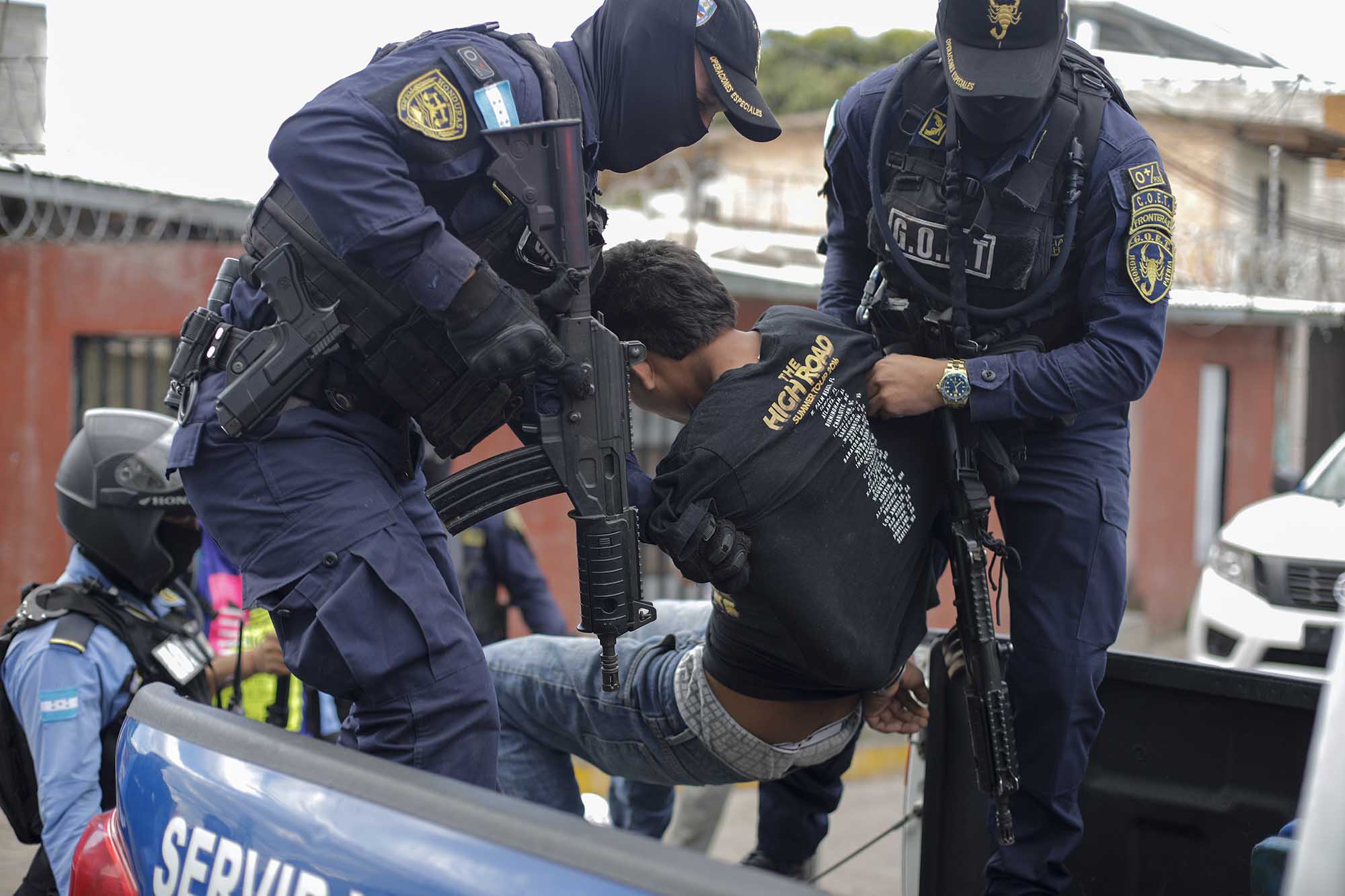 Dos horas más tarde, movido por la curiosidad, recorrió casi un kilómetro hasta la Alemán, la colonia vecina, un «barrio caliente» al sur de Tegucigalpa. Ahí, cerca de una cancha, más de 600 policías posaban para las cámaras que televisaron la medida que suspende seis garantías constitucionales para combatir la extorsión y «delitos conexos» ligados a las pandillas.