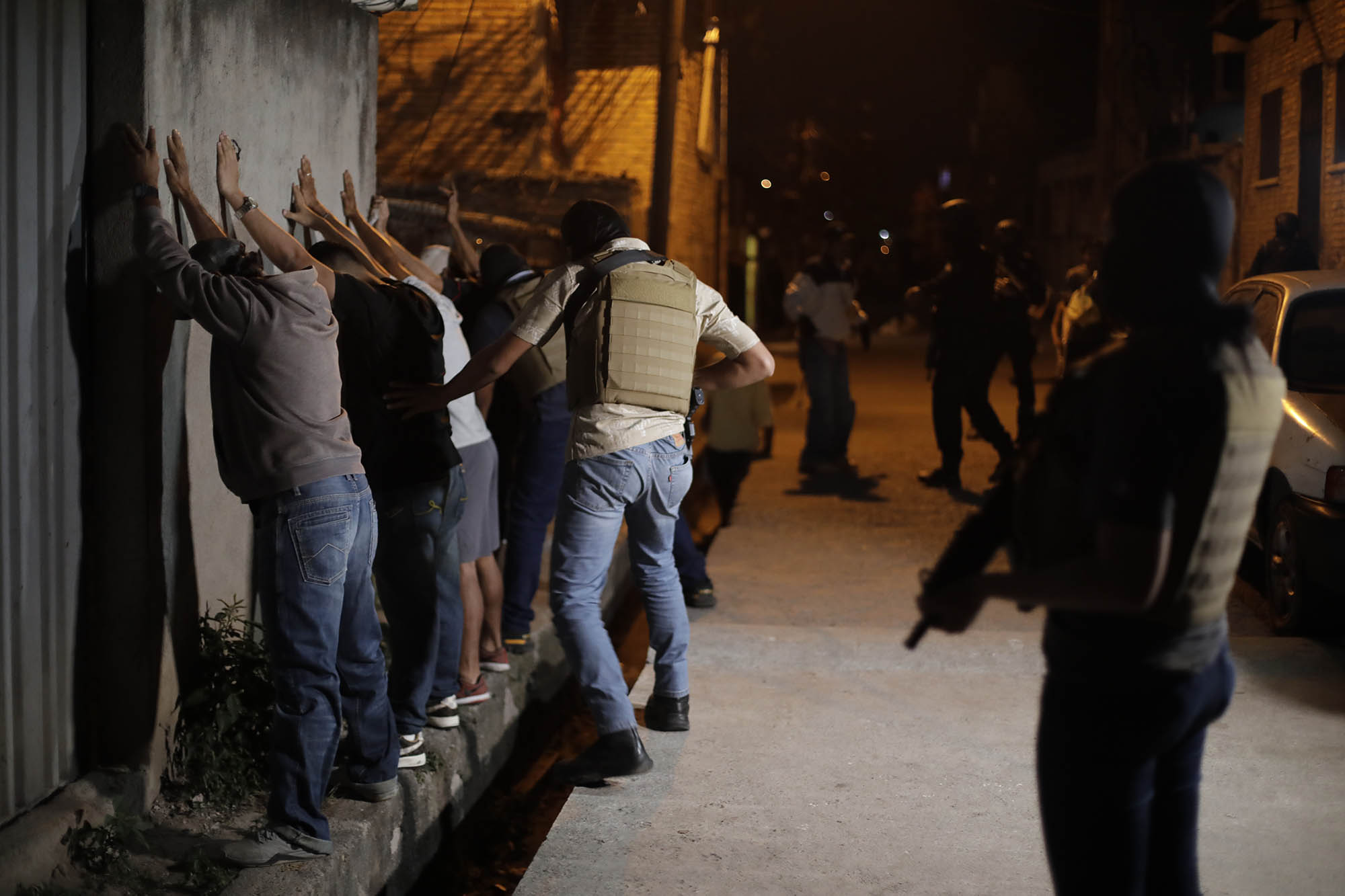 En la primera noche del estado de excepción, Contracorriente presenció los operativos en la zona de La Peña y San Isidro, pero la medida llegó a más de 70 barrios y colonias de la capital listados como supuestos nidos de pandilleros. Agentes de la Dirección Policial Anti Maras y Pandillas Contra el Crimen Organizado (Dipampco) detuvieron a los transeúntes y a los choferes que circulaban y los catearon buscando armas o droga. Mientras tanto, un policía comunicaba el número de identidad a través de un walkie talkie para saber si esa persona se encontraba en alguna base de datos.