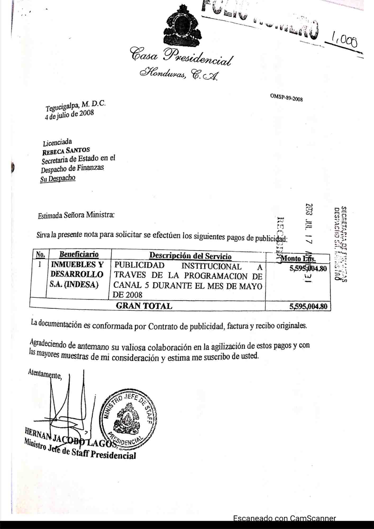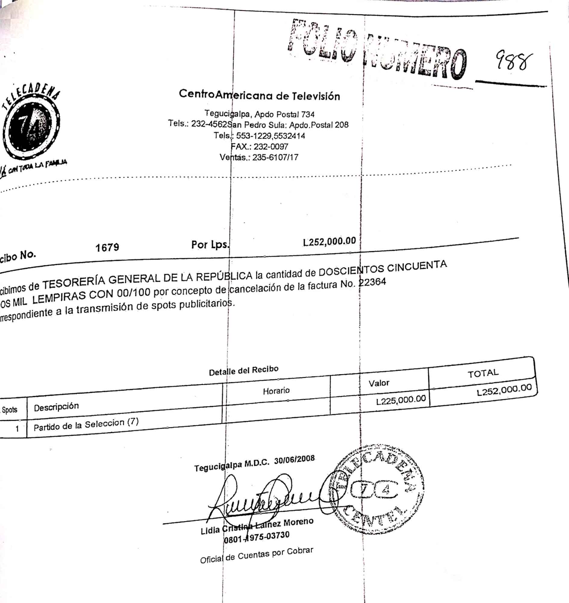 En junio de 2008, justo un año antes del Golpe, un anuncio en medio de un partido de fútbol costó 252 mil lempiras para anunciar al Gobierno del Poder Ciudadano.