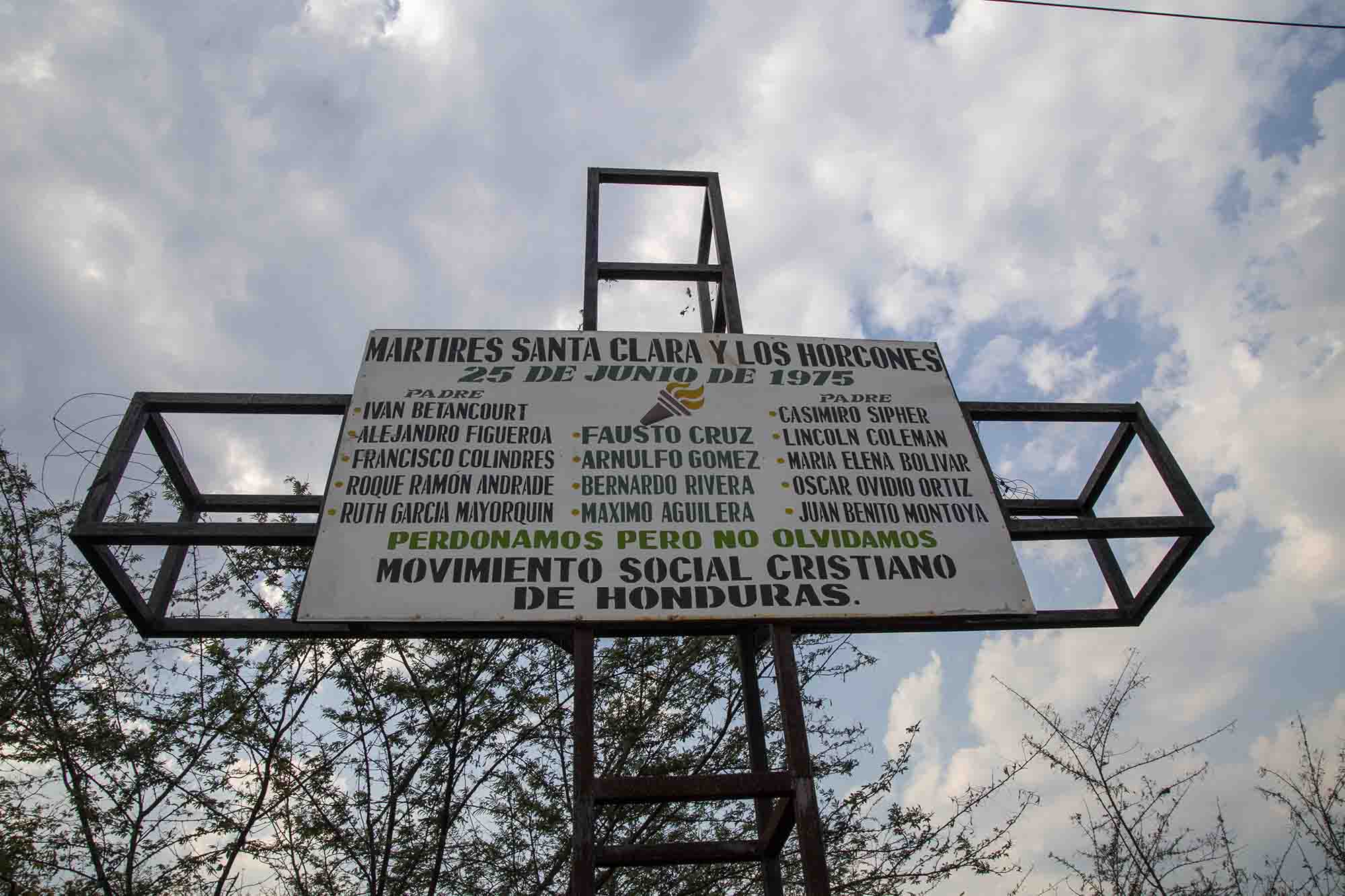 Monumento en forma de cruz en honor a las víctimas de la matanza en la hacienda Los Horcones, una masacre registrada en la finca de José Manuel Zelaya padre en junio de 1975 en Juticalpa, Olancho. En el lugar fallecieron 14 personas, entre estos dos sacerdotes, campesinos y mujeres. Fueron asesinados por el Ejército hondureño en complicidad con José Manuel Zelaya padre, quien fue condenado a 20 años de cárcel y en 1980 indultado por el Gobierno. Foto CC/Fernando Destephen.
