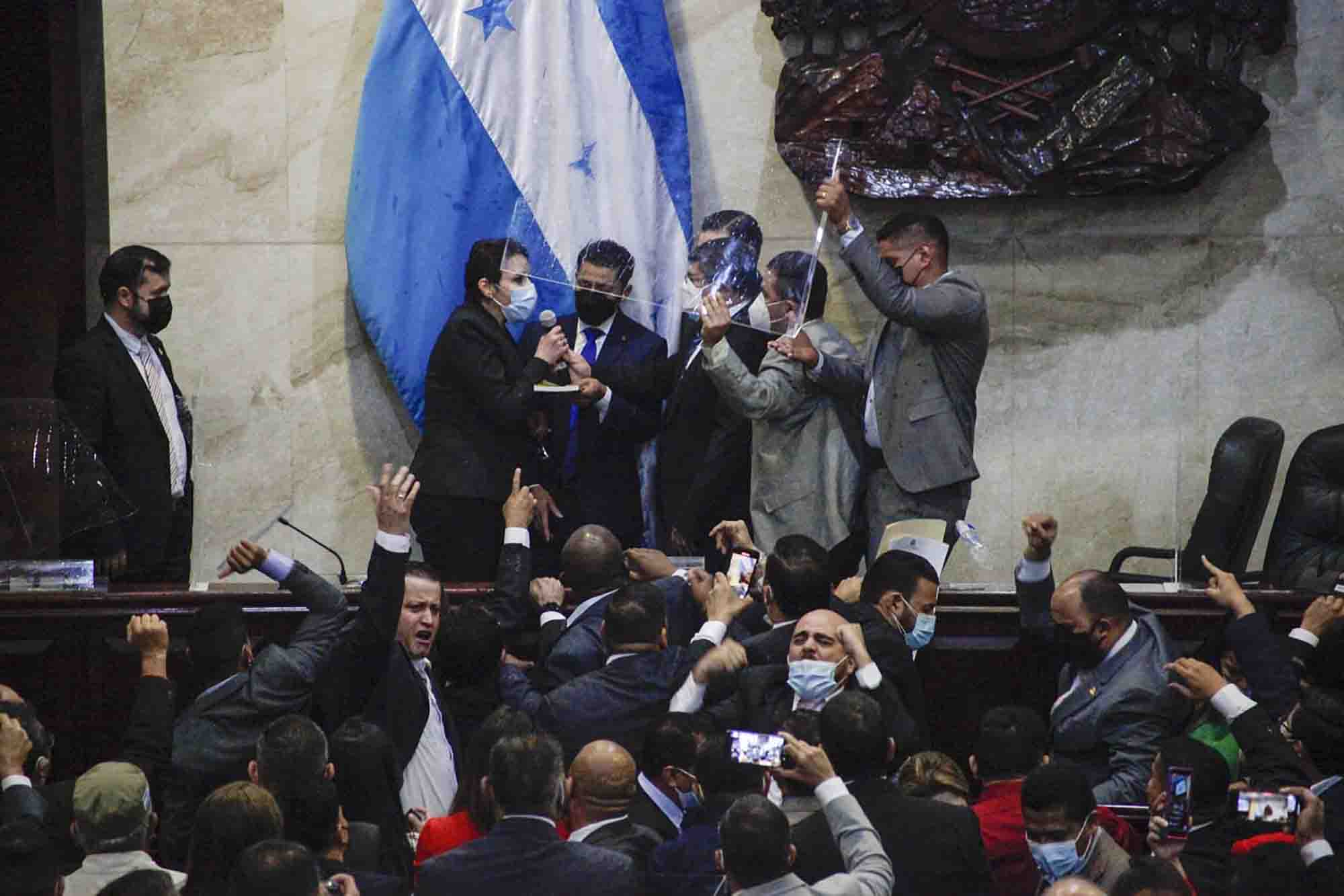 Diputados del partido Libertad y Refundación (LIBRE) se enfrentan durante la elección de la junta directiva provisional en el Congreso Nacional el viernes 21 de enero de 2022, Honduras. Foto Archivo CC.