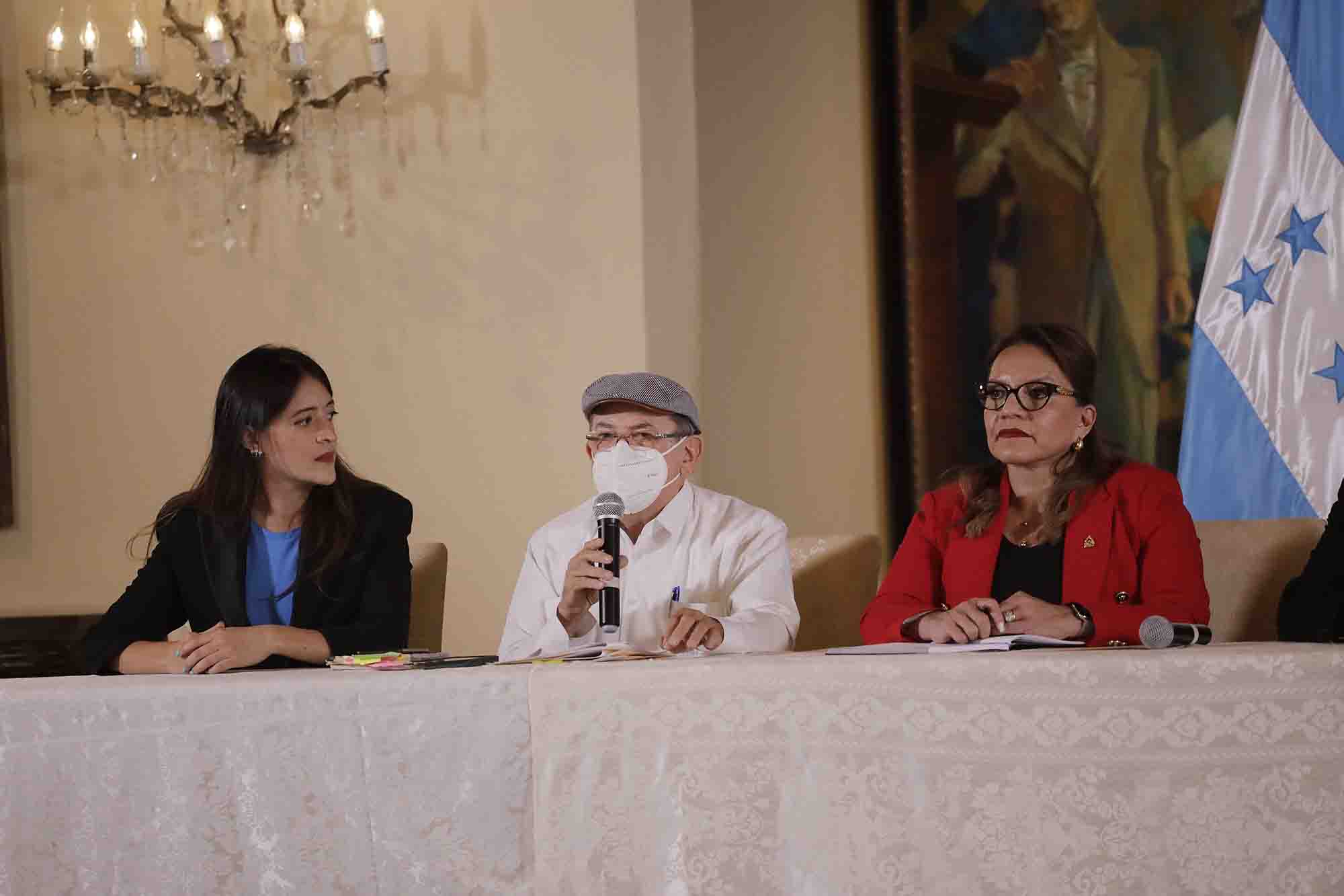(De Izquierda a Derecha) Xiomara Hortensia Zelaya Castro, más conocida como «La Pichu», diputada del Congreso nacional; el comisionado presidencial contra las Zonas de Empleo y Desarrollo Económico (ZEDE) Fernando García y la presidenta de Honduras, Xiomara Castro, durante la firma de sanción de la Ley Orgánica de las Zonas de Empleo y Desarrollo Económico (ZEDE). Foto Archivo CC.