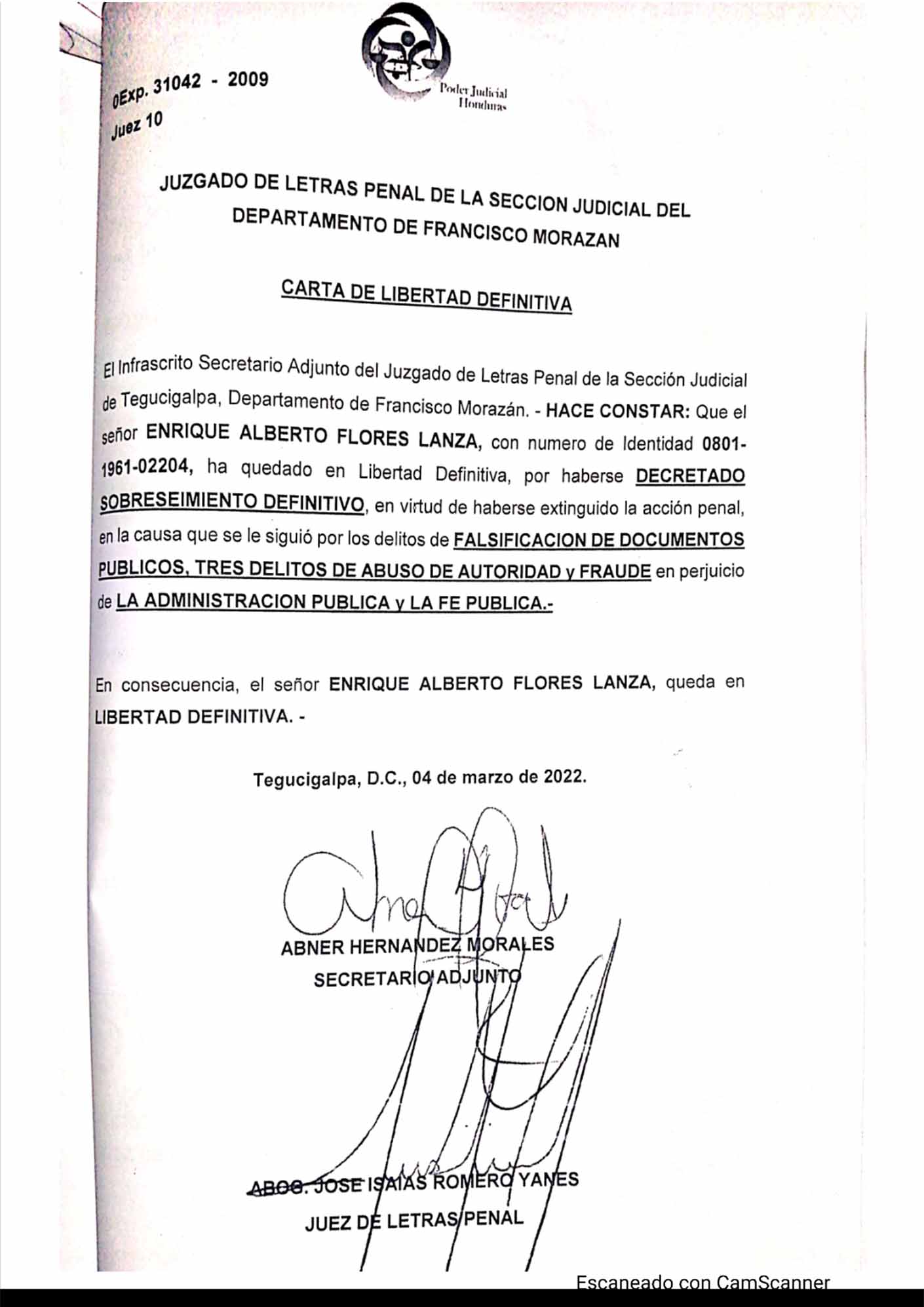 A Lanza le dieron cinco cartas de libertad y la última que recibió fue el 4 de marzo, en la que se le absuelve de los delitos de falsificación de documentos públicos, tres delitos de abuso de autoridad y fraude en perjuicio de la administración pública. En el recibimiento de su amigo, Mel recordó como anécdota y en tono de burla que a él también lo querían acusar por actos de corrupción «hasta por el combustible que gastamos en Casa Presidencial. No vaya a ser que ahora me quieran investigar porque le damos comida a la gente aquí donde los recibimos», dijo.