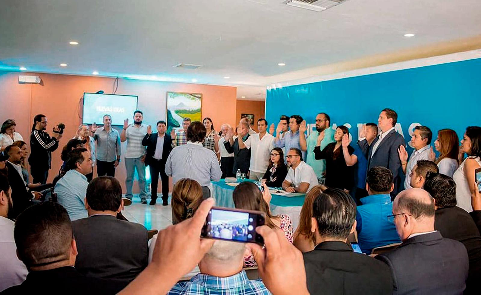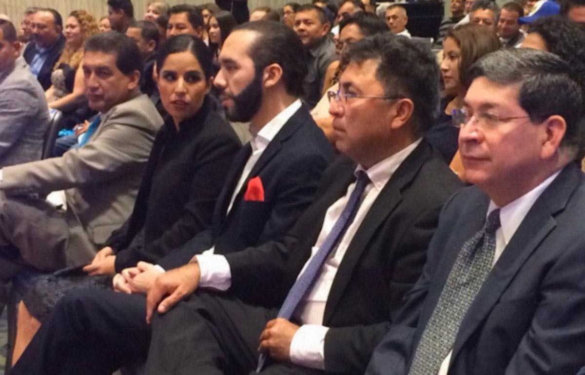 Juramentación de los fundadores del partido Nuevas Ideas en El Salvador. Destacan en la imagen rostros de un puñado de actuales funcionarios. Al fondo, con traje negro, Luis Reyes, quien fuera “coordinador de Nuevas Ideas USA”.