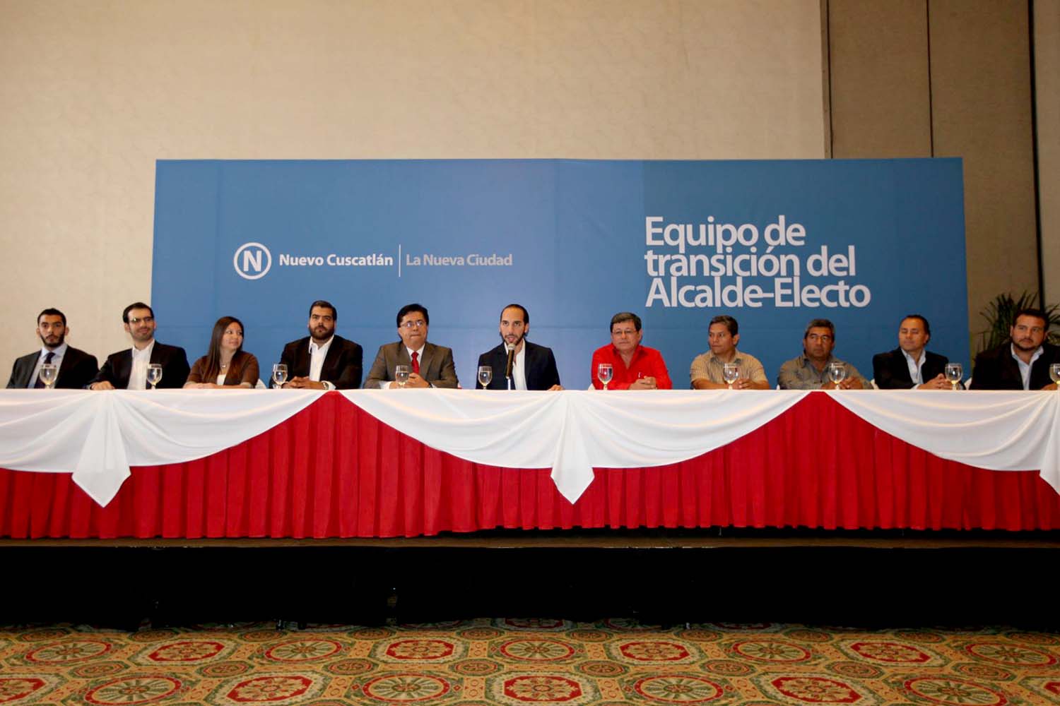 Cuando Bukele ganó sus primeros comicios, en su equipo de transición figuraron dos pesos fuertes del FMLN: Roberto Lorenzana (a su derecha) y José Luis Merino (izquierda). También estuvieron el hoy presidente del congreso Ernesto Castro, su hermano Karim y sus primos Francisco y Xavier Zablah Bukele. Este último (cuarto de izquierda a derecha) es el actual presidente de Nuevas Ideas.