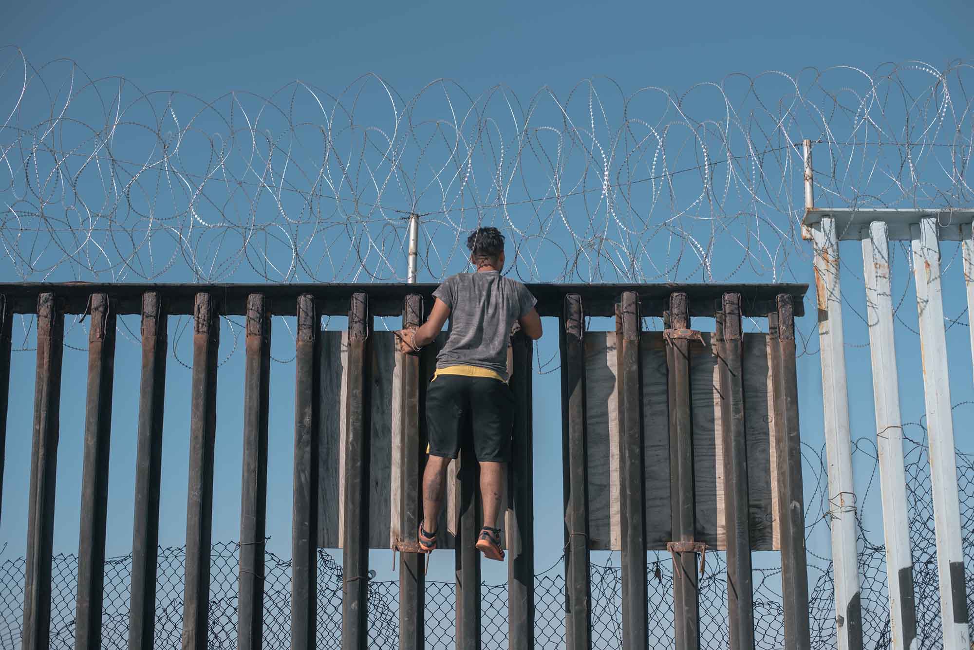 Un migrante centroamericano observa Estados Unidos montado sobre el muro fronterizo en playas de Tijuana. Luis Antonio Rojas, 2018