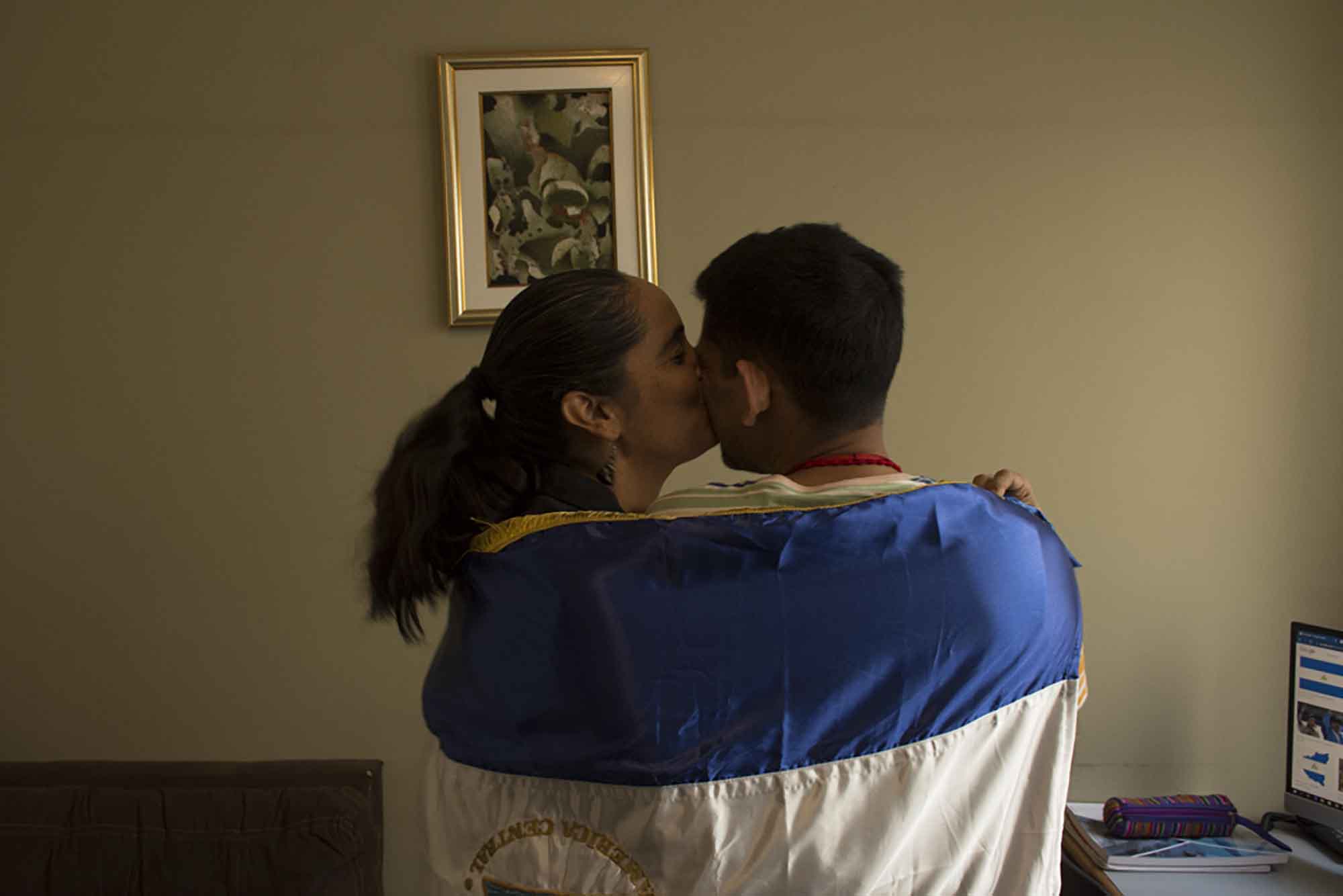 Sara besa a su marido, Joaquín, envueltos en una bandera de Nicaragua en su nuevo hogar mexicano. Jorge Varela, 2022