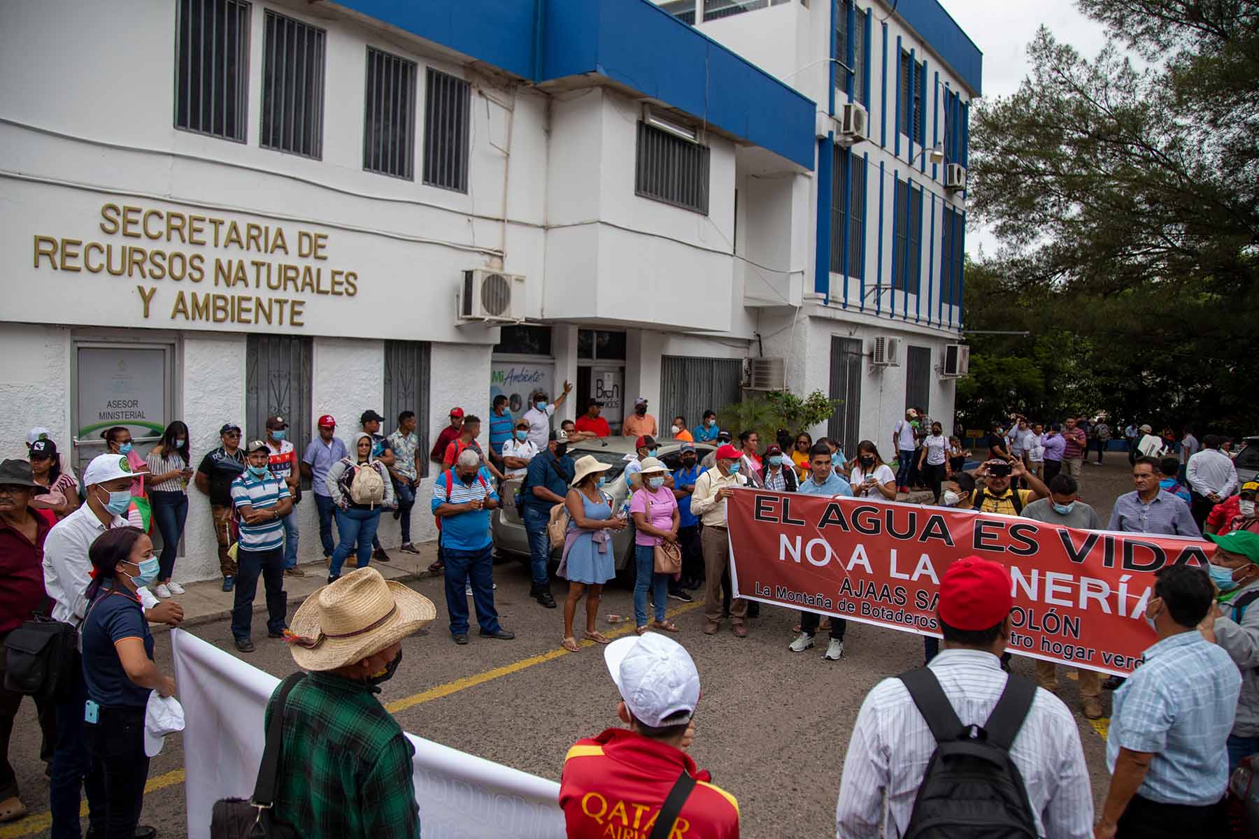 Protegiéndose del sol con sombreros y gorras, centenares de ambientalistas de cinco ciudades de Honduras ubicadas en los departamentos de Colón y Olancho llegaron en la mañana del martes 16 de agosto a Tegucigalpa para hacer un plantón frente a la Secretaría de MiAmbiente. Los manifestantes se posicionaron en contra de la contaminación del agua y de la violencia causada, según ellos, por tres empresas mineras: Canteras y Más, Inversiones Los Pinares y JAMART. «El agua es vida, no a la minería», se leía en un enorme cartel color rojo sostenido por cuatro hombres.