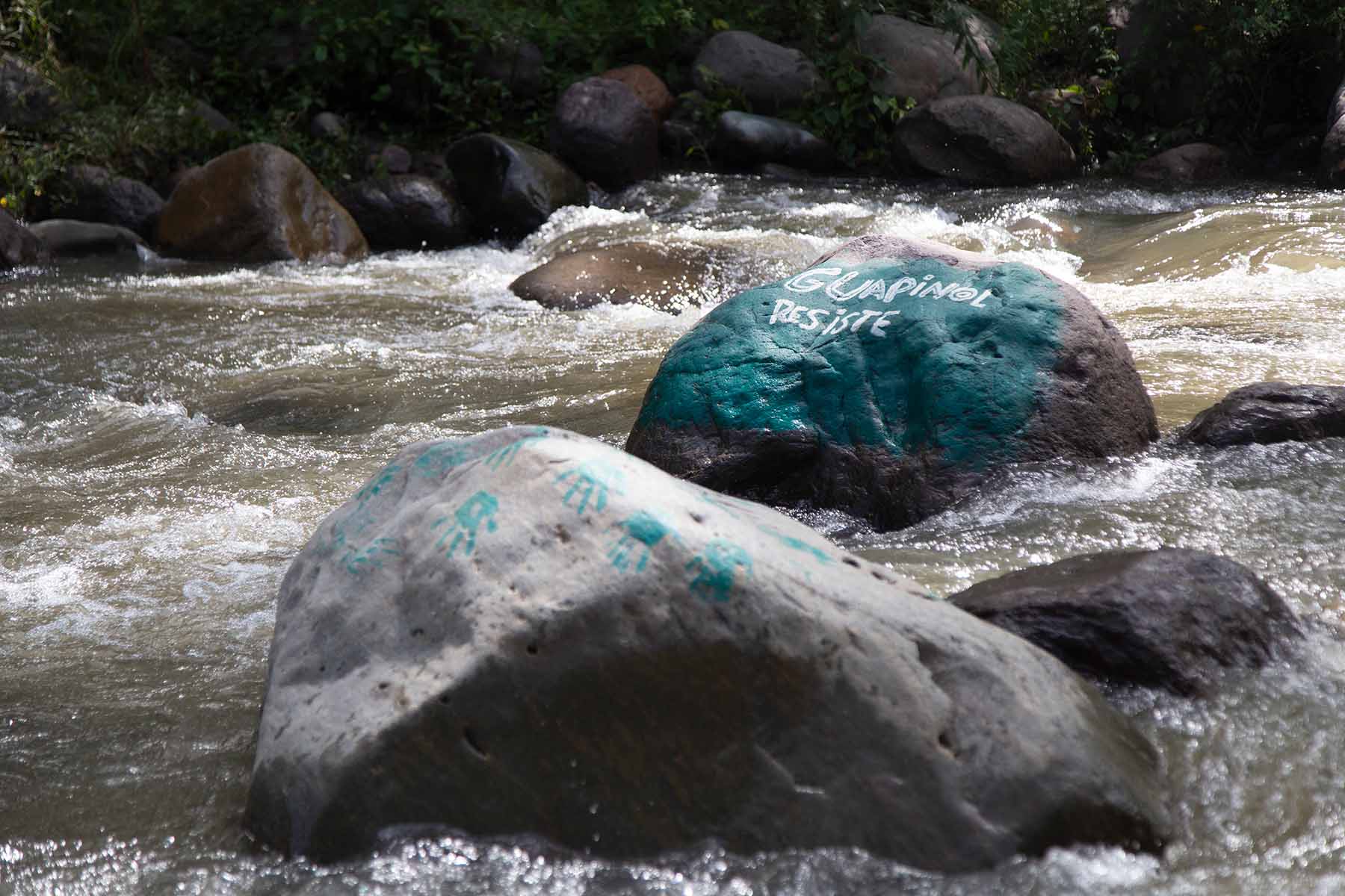Una piedra en el río Guapinol fue pintada por la comunidad con leyendas de defensa del ambiente y protección del río. Tocoa, Colón. Foto CC / Fernando Destephen.
