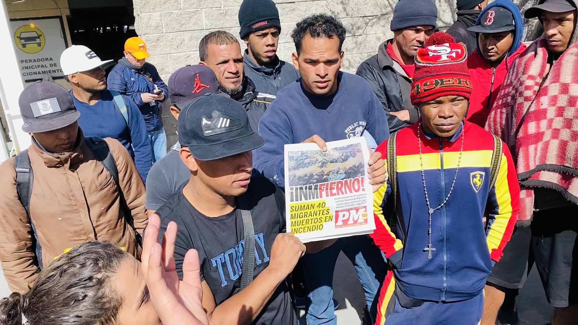 Un grupo de migrantes muestran la portada de un periódico local a periodistas internacionales que han llegado a Ciudad Juárez a cubrir la noticia de la muerte de 40 migrantes en un centro de detención del Instituto Nacional de Migración. Los extranjeros reclamaban haber sido acorralados por autoridades municipales y por agentes de migración mexicana que, con engaños, los habían removido de las calles y encarcelado en una celda que quedó reducida a cenizas por un incendio provocado presuntamente por los mismos detenidos.