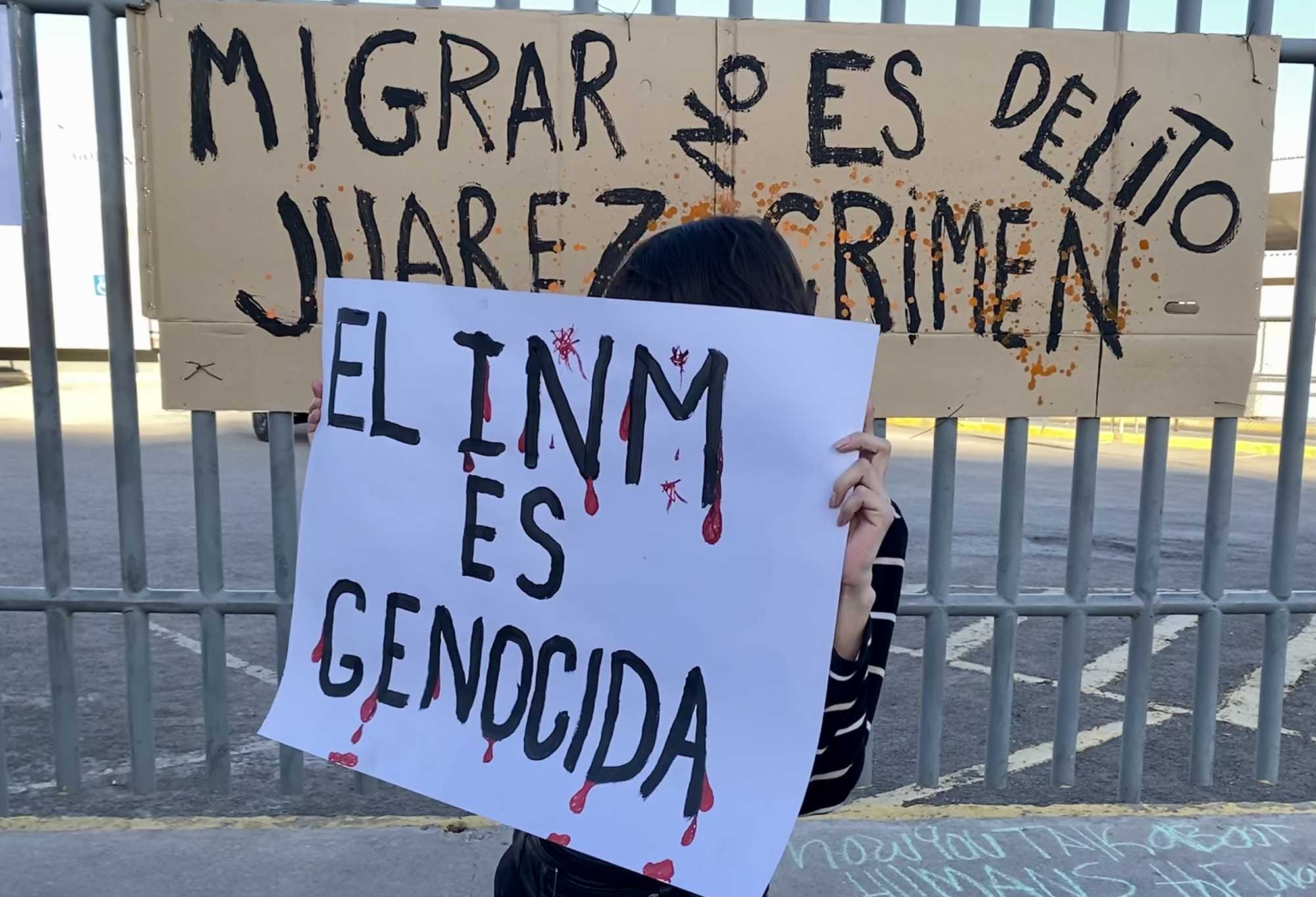 Una joven protesta contra el INM un día después del incendio en el que murieron 40 personas. Para los migrantes en Juárez, perseguidos desde diciembre de 2022,  las autoridades mexicanas son un enemigo del que hay que huir