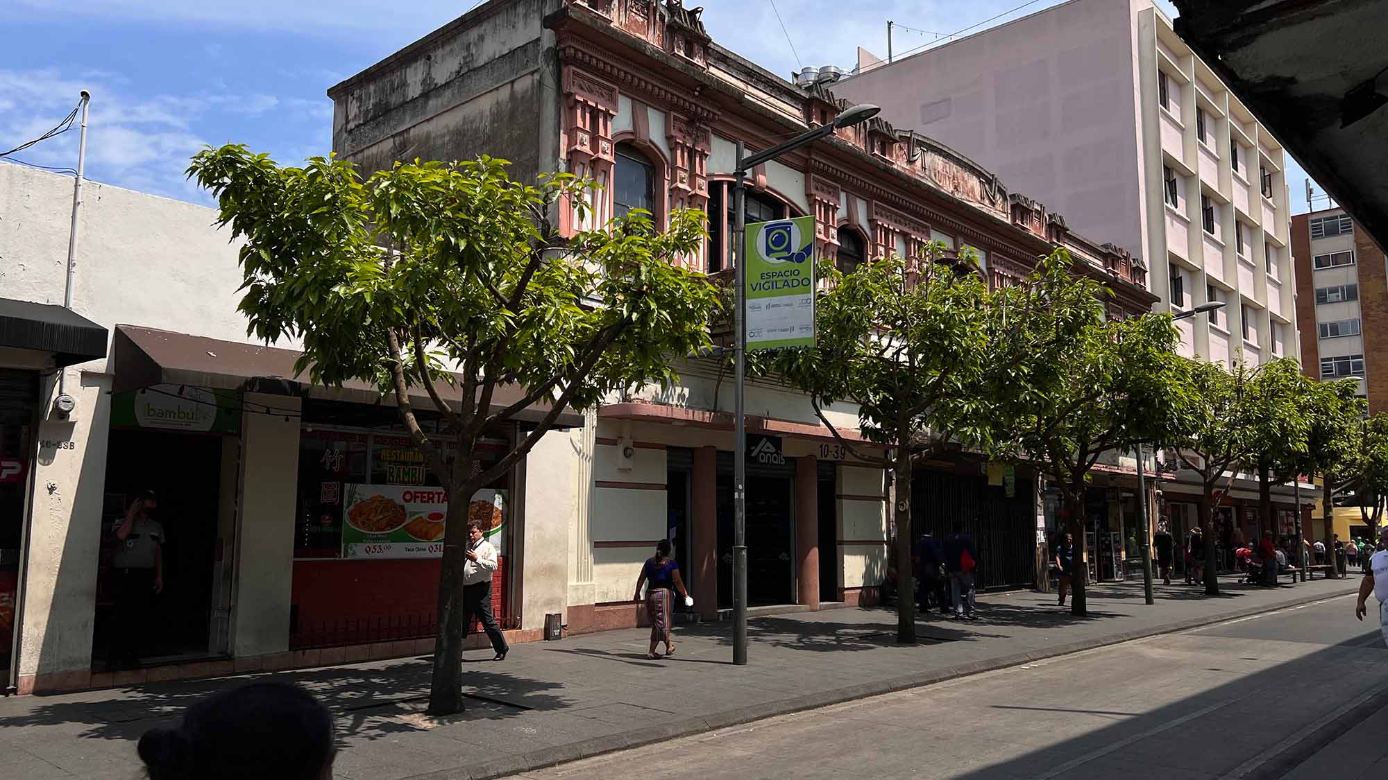 La Sexta Avenida es una de las calles más populares de Guatemala. El lugar que han encontrado como seguro para trabajar, Tatiana, Brandon y Monica. La acera donde suelen trabajar tiene una tienda de zapatos y un restaurante chino. Fotografía: Jovanna García