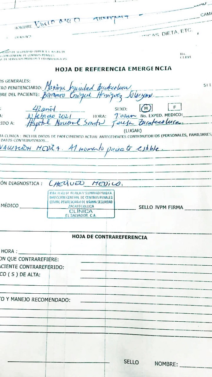 El protocolo indica que las consultas debían ser programadas con previo aviso a través de la tarjeta hospitalaria, en cambio, lo que llegaba era otra orden. “Se le daba cumplimiento porque era un orden del director general”, dice Lucas, “nosotros solo obedecíamos. Para decirte que algunas veces ellos (los pandilleros) ya sabían y decían ‘hoy no me han venido a traer y hoy me toca ir al hospital’. Les preguntábamos si tenían cita y decían que sí, pero cuando íbamos a clínica a preguntar decían que no tenían nada. Pero al rato llegaba la hoja donde decía que saquen a tal fulano y ahí se daba el procedimiento normal: ir a traerlo a celda, darle la custodia al hospital y de ahí para allá. No sabíamos qué pasaba adentro”.