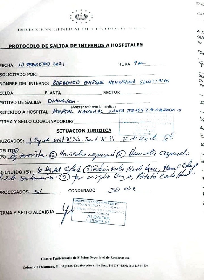 Protocolo de salida de internos a hospitales donde se lee que el motivo de salida de Diablito es “evaluación” / La Prensa Gráfica
